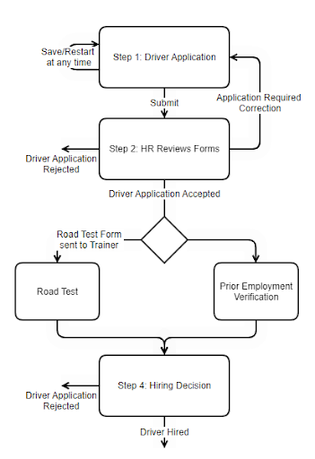 Upon review of all submitted information and documents, along with feedback from Previous Employers and Road Test, the Hiring Manager can extend a job offer or decline the application. Hired applicants are added to the Active Driver List.
